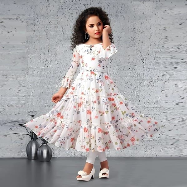 Twirl-ready white gown with colorful floral prints and a full-length flowy design. Looks just like a princess dress! Best for birthdays, weddings, and photo sessions.